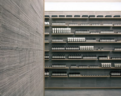 Succintly filled with oak shelves stocked with products aligned with spartan precision, the main feature of this space, however – and nearly unseen due to its very subtle texture - is the the concept of newsprint walls (stacked strips of newspapers held within a continuous oak wrapper), covering nearly every surface of the shop. Like paper, they will age over time, in this way, the history of Aesop North America will be recorded within the very walls of this first store.